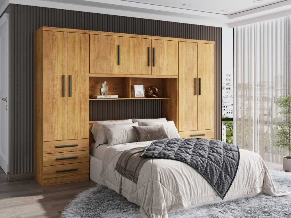 O Guarda Roupa Acoplado México + Floripa de Casal 7 Portas é ideal para otimizar o espaço do ambiente e deixar tudo organizado. Possui 3 nichos internos, 2 nichos externos, 1 baú na cabeceira, 7 portas articuladas, 5 gavetas externas com corrediças metálicas. Possui pintura UV com acabamento texturizado amadeirado, que oferece ao produto resistência e durabilidade.