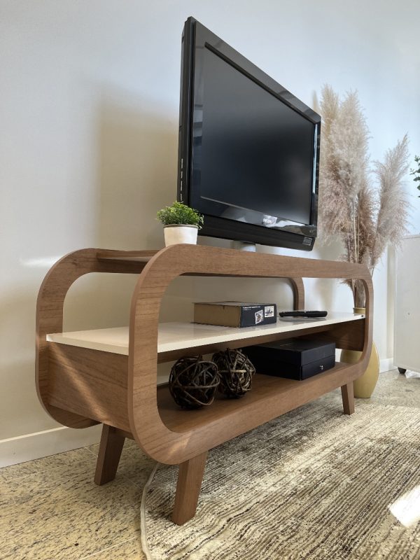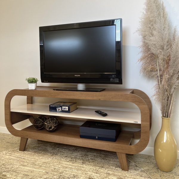 O Rack Théo apresenta um desenho arredondado com laterais e fundo vazados, incorporando um design leve e minimalista, perfeito para quem busca um toque retrô mais sutil. A beleza reside na simplicidade. O design leve deste móvel traz consigo um ar descomplicado, sem excesso de detalhes, proporcionando um visual clean.